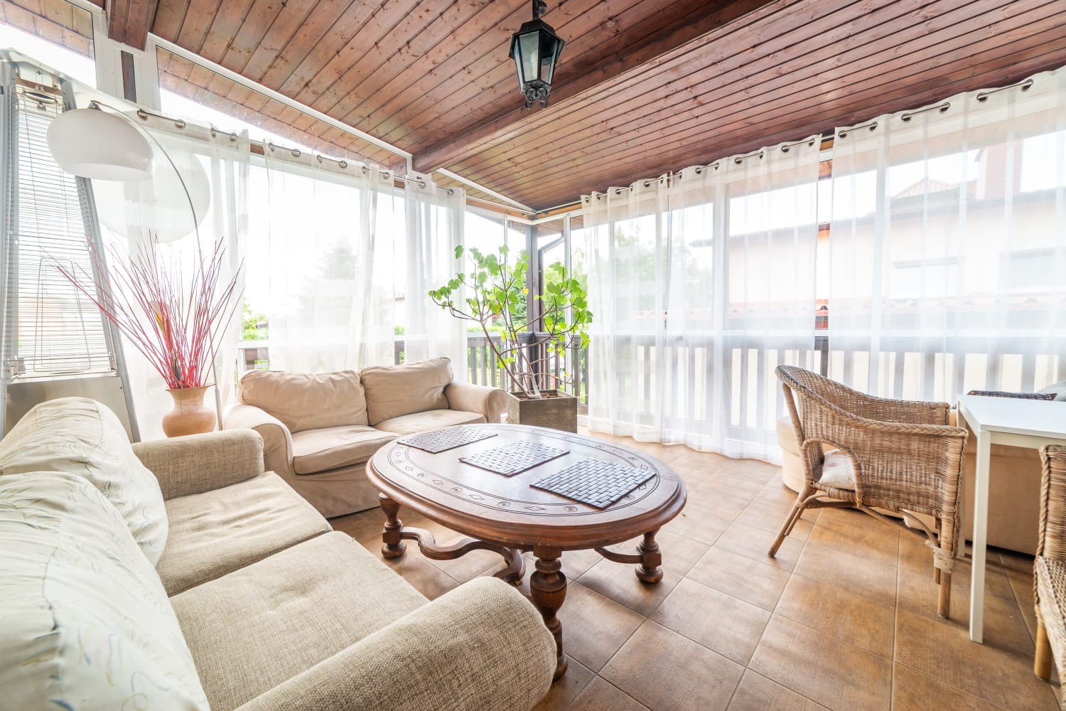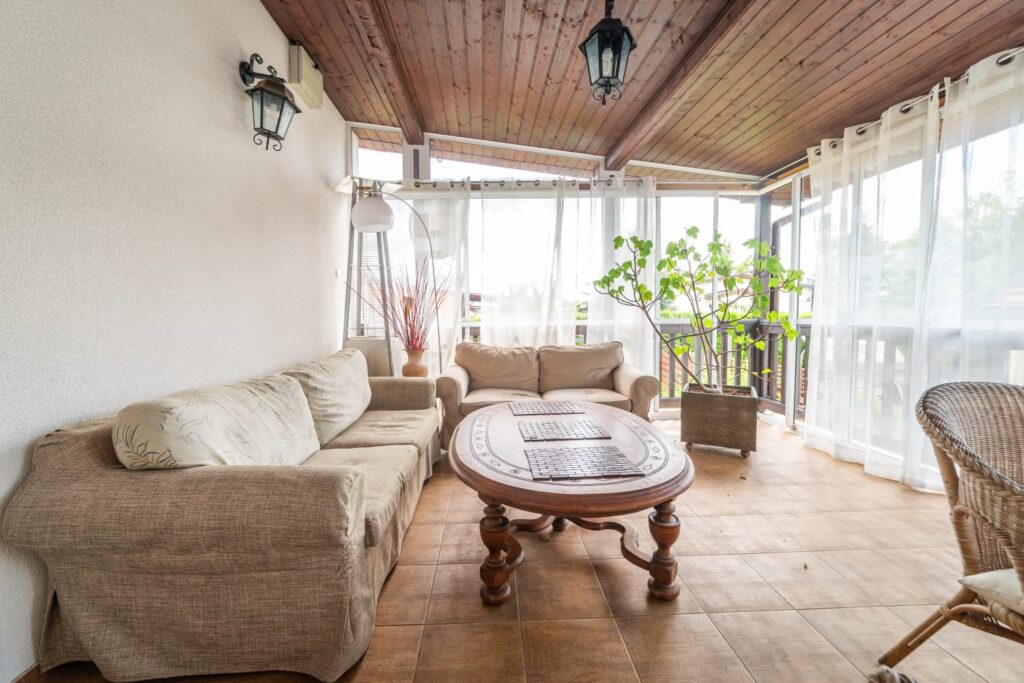 Do apartamentu przylega duży zadaszony taras z meblami wypoczynkowymi.
